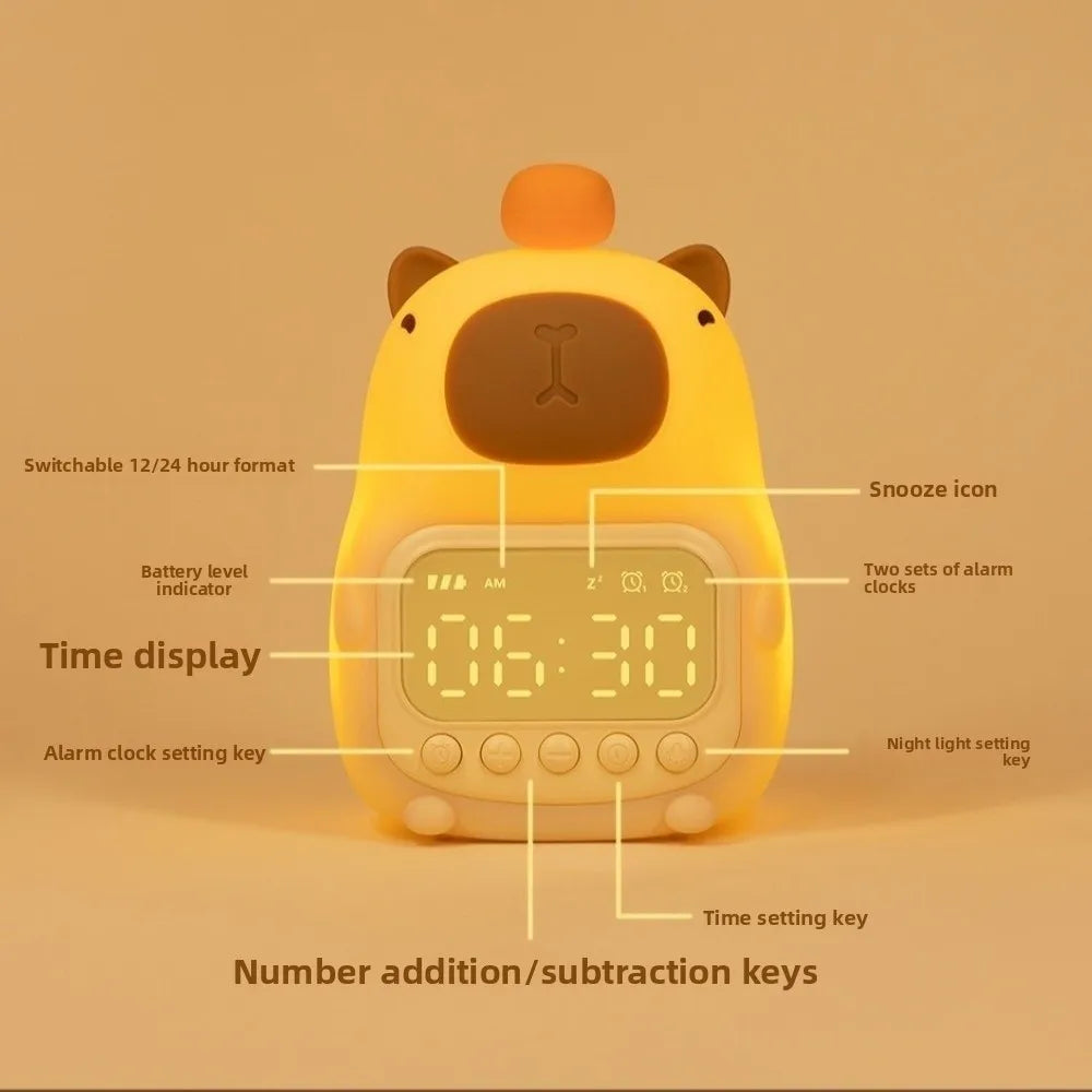 DomSupplies™ Soft Cartoon Capybara Alarm Clock & Night Light – USB Rechargeable Silicone LED Bedside Lamp with Soft Glow